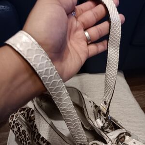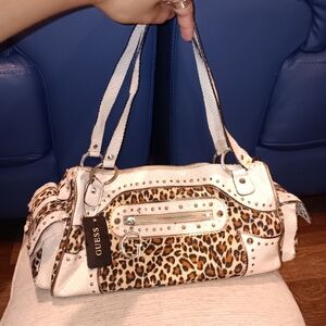 Stylish GUESS shoulder bag with leopard print. Cream and brown tones. Perfect for any outfit.