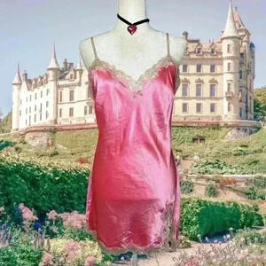 Y2k 90s Shimmery Pink Victoria’s Secret Slip, pink satin, has cute gems on the lace, white lace detailing, adjustable shoulder straps, cute pink satin bow on the bust area and the leg slit at the bottom, super soft body magnifying material, Materials are polyester and nylon. Brand: Victoria's Secret