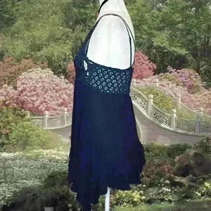 Y2k Free people navy blue fairy core dress, gorgeous embroidery detailing on the bust area, waist, and back is see-through but not completely see-through, double layered asymmetrical hem, shoulder straps cross on the back, adjustable shoulder straps, light weight, and breathable material. Materials are viscose/nylon/cotton. Brand: Free People