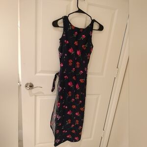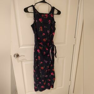 This elegant sleeveless dress features a vibrant floral pattern on a navy blue background, perfect for this summer. The pink flowers add a touch of color and charm. SO soft. In great condition with gentle signs of wear. No major flaws.