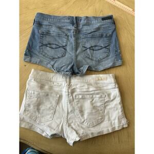 Elevate your summer wardrobe with this lot of two Abercrombie & Fitch denim shorts. The white and blue shorts are made of a comfortable cotton blend material with a light fabric wash. They feature a mid-rise waist of 28 inches, a 3-inch inseam, and a flat front design. The shorts have five pockets and a button accent.