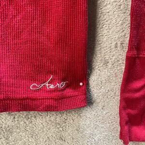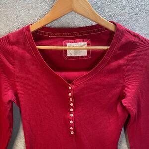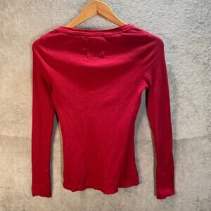 Stylish long-sleeve Aeropostale thermal knit top, a versatile addition to your wardrobe. This red blouse features a flattering V-neckline with a button-down design, adding a touch of sophistication to the casual thermal texture. The shirt has a slim fit, accentuating the figure while providing comfort. This top is perfect for layering in cooler weather or wearing alone for a relaxed yet put-together look. Suitable for casual outings, cozy nights in, or even a stylish touch to your workout attire, offering both style and practicality.