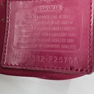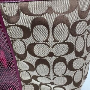 Keywords: Coach tote, designer handbag, monogrammed, signature print, burgundy accents, snake print detail, everyday bag, shoulder bag, fashion accessory, classic style, iconic print, practical tote, preowned luxury