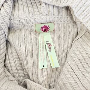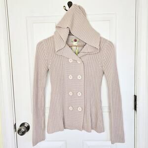 Hooded ribbed cardigan with double breasted button detail. In a neutral tan brown color. Labeled as a size small. See measurements.