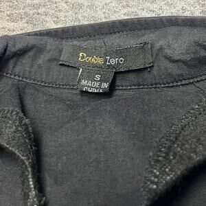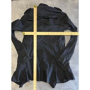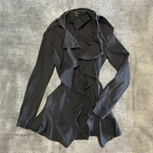 -Black lightweight jacket with dramatic ruffle front and shoulder details. Flowy fit, perfect for layering.