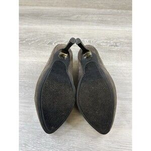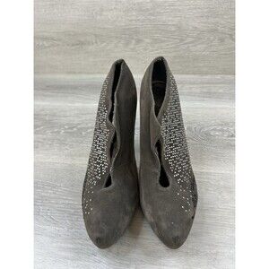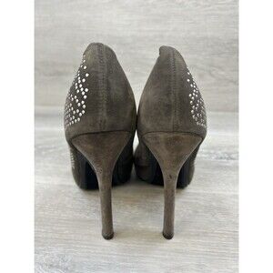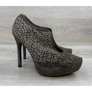 This Y2k Ed Hardy Women's Stiletto Heel is a stylish and edgy pair of pumps in a size US 6. Featuring a closed toe design with slip-on closure, these ultra-high heels are adorned with studs for added flair. The gray faux suede material and stiletto heel style give off a modern and outdoor-themed look. Perfect for travel or casual wear, these pumps offer comfort and breathability with a rubber outsole, making them suitable for all seasons.