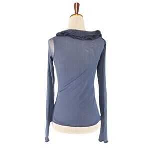 Y2k Euro Mesh Navy Blue Cardigan w/ Ruffle Front & Satin Bow - Small