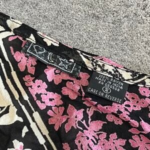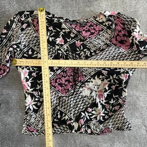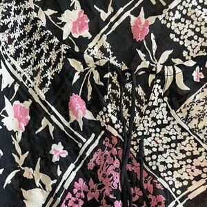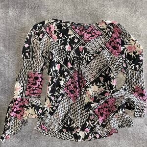 -Lightweight long sleeve blouse with a patchwork-inspired floral print in black, cream, and pink tones. Features a flattering v-neckline with tie detail and flowy sleeves that give it a relaxed, boho feel. Perfect for pairing with jeans or a skirt for an easy day-to-night look.
