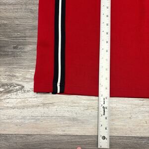 please note visible stains on the front, lightweight 100% Polyester made in India, pullover style, single stitch, spell out logo, red/white/navy blue two lines striped pattern, streetwear sporty athleisure