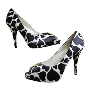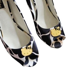 Y2k Hello Kitty Black and White Heart Patterned Peep Toe Heels Womens Size 8.5
