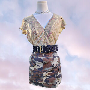 Y2k Justify Green Camo Cargo Pocket Grunge Punk Cyber Mini Short Skirt. This skirt has two flap pockets in front that are fully functional. This skirt also belt loops , and the waist has some elastic to it, so there is a little bit of stretch.