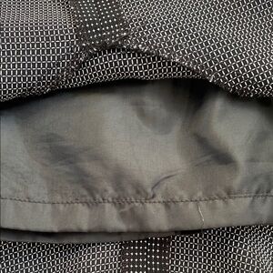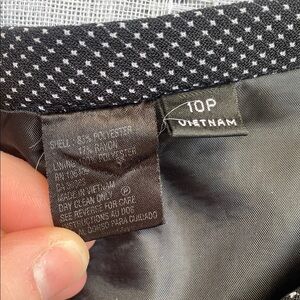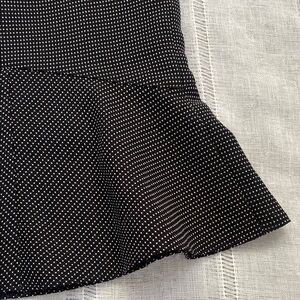 This knee-length pencil skirt in a dark back with mini white polka dot print features a fitted silhouette with a stylish ruffled flounce at the bottom. Perfect for work or cocktail occasions, it combines elegance with a vintage touch.
