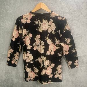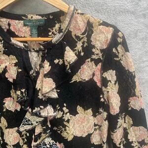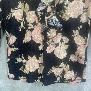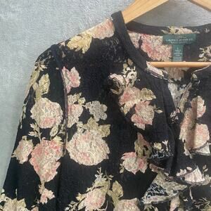 Romantic floral lace top from Lauren Jeans Co. featuring a sophisticated black backdrop adorned with delicate pink and rose floral patterns. This blouse offers a charming ruffle front detail adding a touch of elegance. The 3/4 sleeves make it a versatile piece for different seasons. Perfectly suitable for a garden party, a casual brunch, or a date night. Keywords: Lauren Jeans Co., Floral Top, Lace Blouse, Black Floral Top, Pink Rose Top, Ruffle Blouse, 3/4 Sleeve Top, Romantic Blouse, Women's Top, Floral Lace, Elegant Blouse, Casual Top, Spring Top, Summer Top Measurements * please refer to the last photo Please compare the measurements to something you already own Condition * gently used pre owned condition * no flaws Offers & bundles are welcomed / Orders ship next business day