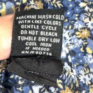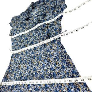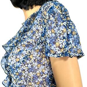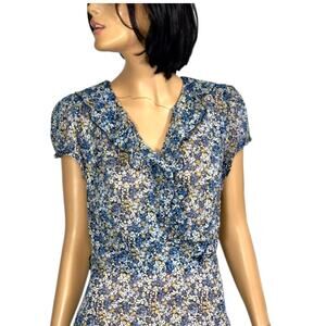 Blue ditsy floral sheer chiffon midi length dress with a flowy feminine silhouette and lettuce hem. Ruffled surplice neckline with single hidden button closure. Short cap sleeves with button detail. Belt loops, no belt. A-line, fit & flare. Y2k Vintage Vibes. MSK, Size 8. Measurements in pics.