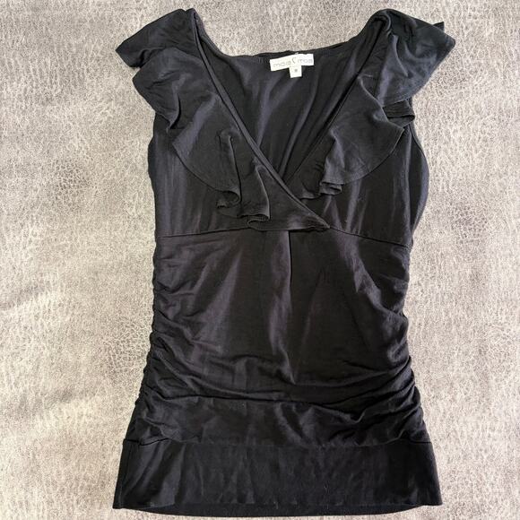 Black ruffle wrap-style top with a soft V neckline and subtle ruching through the waist. Flattering and feminine with a slightly dressy feel, perfect for date nights, layering, or elevated everyday outfits.