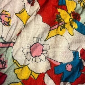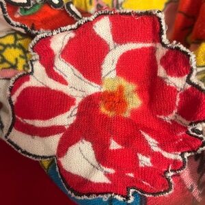 Bold abstract design with ruffle accents. Features red, pink, yellow, and green hues.