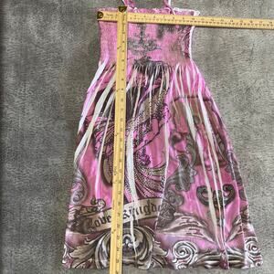 -Y2K pink graphic print dress with smocked stretchy bust, tie spaghetti straps, and flowy skirt. Features baroque-inspired graphics and rhinestone details for an early 2000s glam vibe. Ed Hardy style