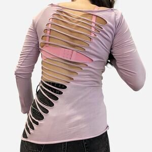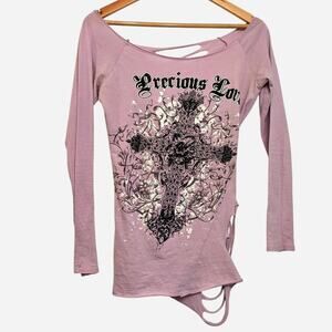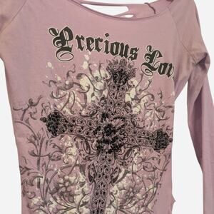 Vintage Y2K Purple Top with Distressed Back, Cross Design with Black Rhinestones and Goth Typography that says "Precious Love". This is literally a Y2K Vibe and can be worn with baggy jeans, short jean skirt or however you want to style it. The neckline falls on the shoulders and the side stitching and holes are warped to the side. Size Small. 26.5" Long and 17.5" from pit to pit.