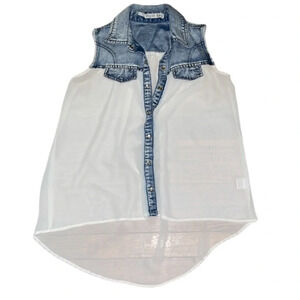 Size extra small cupids diary denim top mix media fringe holder pearl snap sheer bodice flowy top
