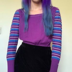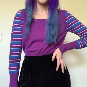 Purple scoop-neck sweater. Whimsical blue, silver, and purple striped sleeves. Fitted knit band around bottom. Perfect for accented waist line or for tucking into highwaisted pants. Stretchy soft knit sweater
