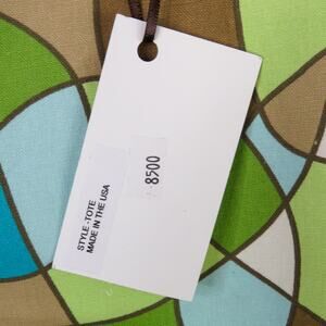 Circa Late 90s Early 2000s Vintage Shoulder Bag Tote Bag. Lime Green, Bright Blue, Brown, and Tan Geometric Swirly Abstract Print. Cute Blue Glass & Brown Wood Beaded Tassel. Deadstock Vintage Brand New with Tags