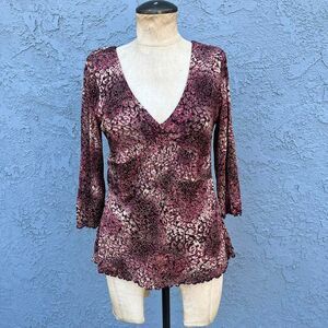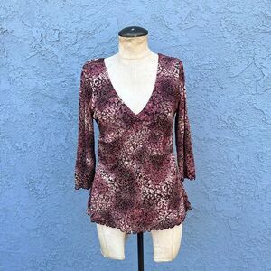 Burgundy and purple floral V-neck y2k blouse with 3/4 sleeves. Shirred bust in front. Womens medium.