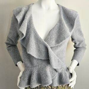 Gray faux wrap style cardigan with dramatic ruffles along the neckline, collar, and hemline. Snap button closure. Collar has a beautiful pointelle or crochet look knit. Marked as a size large. See measurements.