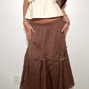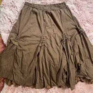 y2k allison britney brown midi skirt with ruffles and green details! very earth fairy! also has a euro vibe to it! perfect for fall! size large. waist 15-24” length- 26”