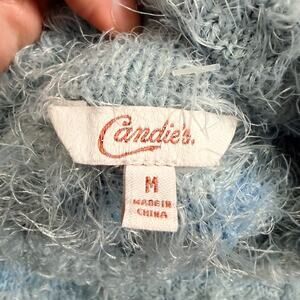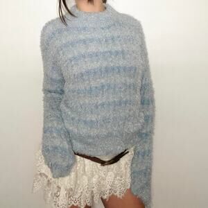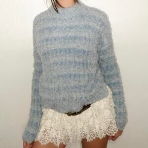 y2k candies baby blue fuzzy striped sweater with mock neck. size medium ptp 22-36