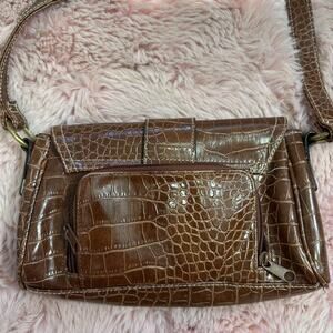 y2k warm brown croc print shoulder bag with gold hardware! perfect condition! has a wallet compartment on the back which i loveeeee width- 10 length- 6