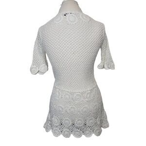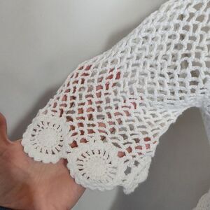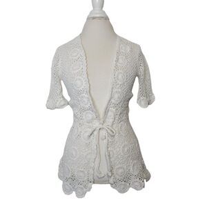 • Cutest short sleeve crocheted cardigan. It has an adjustable tie and buttons in the front. Drawstring can hit at your waist or lower down. However you prefer! Posted pics of it both ways. Ramie/cotton blend.