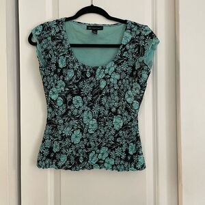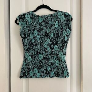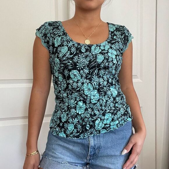 Description: 90s y2k top, floral prints, stretchy material, lined, subtle lettuce sleeve detail, lettuce hem