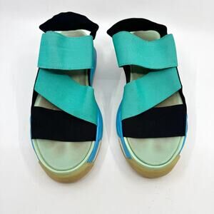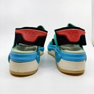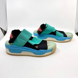 Details: Y-3 adidas x Yohji Yamamoto Hokori Sandals in Black / Vivid Mint / Bright Cyan. Chunky platform silhouette with bold color contrast and strappy athletic design. Elastic strap closures, cushioned foam footbed, and Y-3 midsole plugs for all-day comfort. TPU Y-3 logo at the heel. Lightweight yet robust construction. Blends sporty utility with avant-garde styling — a signature look from the Y-3 collaboration.