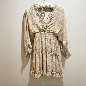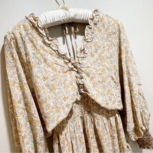 YA LOS ANGELES Women’s Beige Blue Yellow Floral Dress Ruffles Puff Sleeves Sz S
