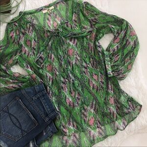 Ya Los Angeles long sleeve sheer blouse. Great colors!!! Pair with your favorite tank since it’s sheer and a pair of skinny jeans. Perfect!! Top front can be tied in a bow for a great finish. Great condition. Size XS. Approximate measurements on photos. 100% Polyester.