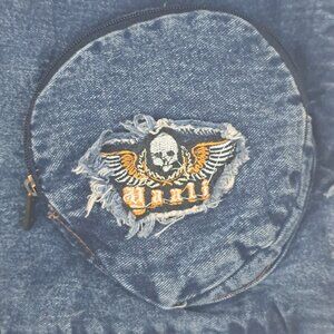 YAALI Denim Distressed Shoulder Tote Bag. Double strap, top zip closure, front outside zipper round pocket. Two patches: winged scull with logo and scull with winged dragon like figures. Frayed/fringe detail around the sides and bottom. Inside is one large compartment. Preowned- in great condition. Please see pictures for approximate measurements. Unique bag. Great for travel, everyday, beach, festivals, school bag. Boho, bohemian, grunge, hippy, gyspy, Coachella, biker vibe.