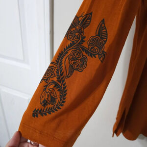 Long sleeve deep v-neck with tassel detail. Bell sleeves. Boho print on chest and sleeves. Really soft fabric.