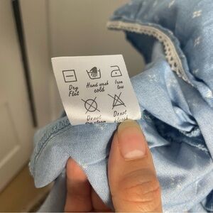 In like new condition. Pretty thin lace details, printed fabric. Side pockets, puff sleeves.