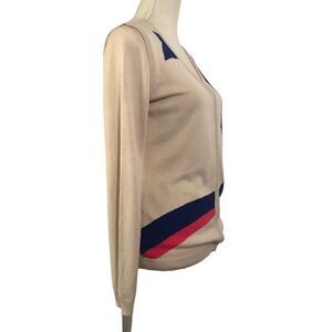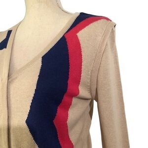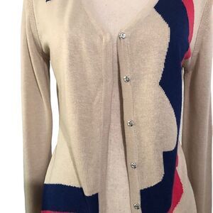 YAL lightweight cardigan sweater with snap front closure. Wear open or fully snapped for two different looks. Great for the office or casual with jeans. Pretty large abstract print in tan red and royal blue.