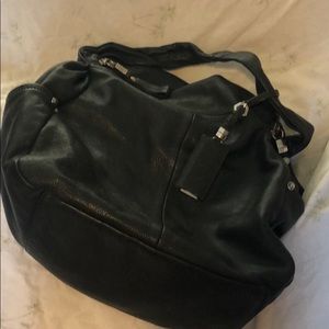 Beautiful soft leather w pockets on either side, compartments for every personal need. The color is a dark forest green (almost black)
