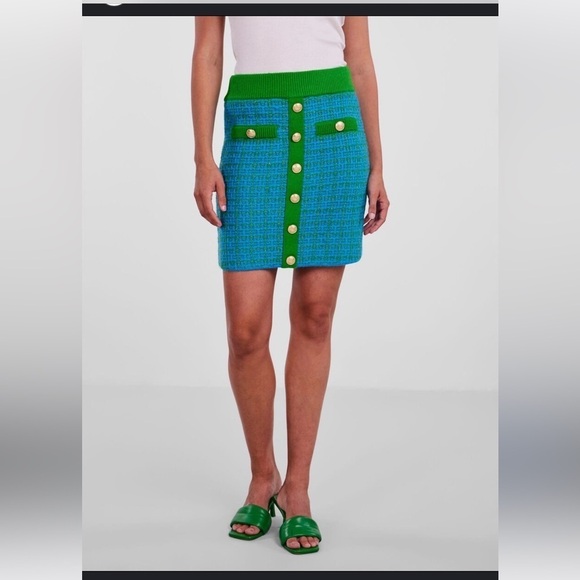 NWT Y.A.S boucle button up mini skirt in blue and green plaid size L ( does have a few snags can hardly notice and can be fixed)