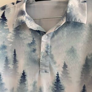 Featuring a vibrant white and blue pine tree pattern, this polo is a stylish addition to any wardrobe.