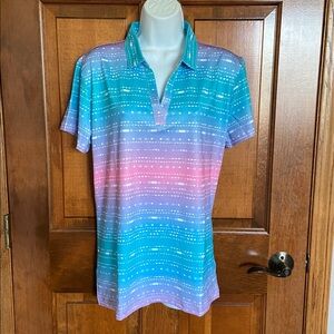 Golf Women's Golf Polo. It features a colorful, striped design, such as the "Mojave Sunset" .