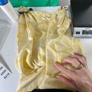 CONDITION: Teal Stain. Small Cut. Pre-Owned *These are good condition items, expect some natural wear if not new with Tags- Pre-loved items may have stains, pulls, loose threads, and general wear and tear. *Green mark and a pull near bottom of dress- See photos for condition & measurements