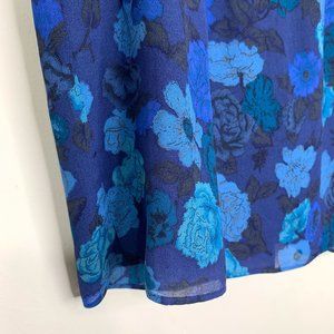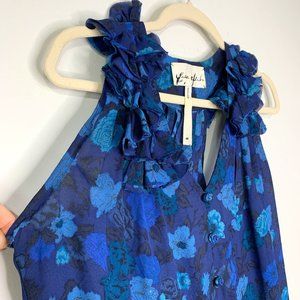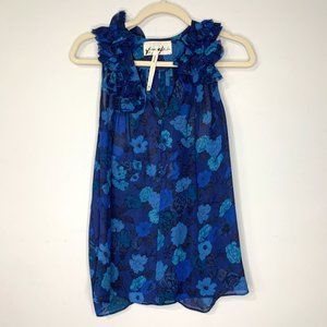 YAYA AFLALO Viola Indigo Silk Floral Print Ruffled Sleeveless Blouse Top Sz M