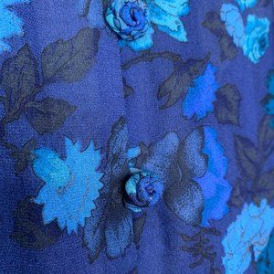 All-over blue floral print in pullover style blouse with 3 self-fabric covered floral-shape buttons, v-neck, pleated back and lavish raw-edge layers of ruffles at top. Unlined, semi-sheer. 100% silk. Dry clean.