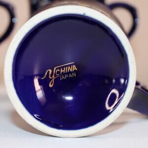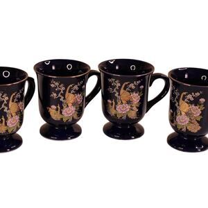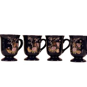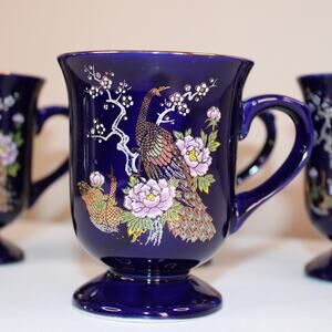 YChina Japan Pedestal Mug SET of 4 Cobalt Blue Peacock And Floral Pattern