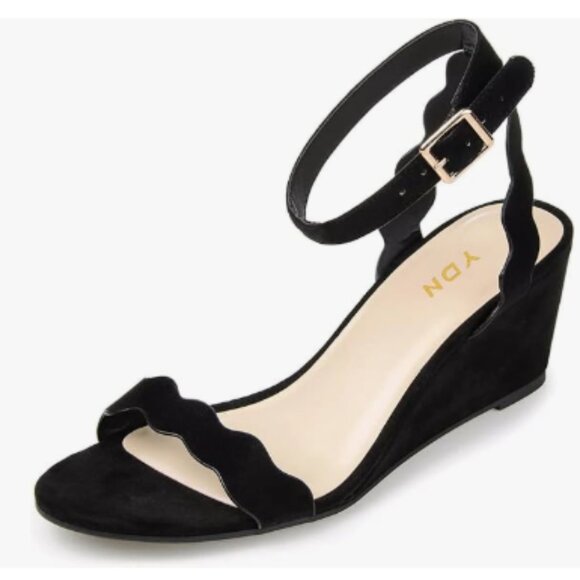 YDN Black Open Toe Ankle Strap Sandals Ruffle Band Wedge Heel Date Evening Shoes