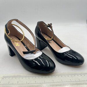 YDN Black Round Toe Block Heel Pump Adjustable Ankle Strap Shoes for Office Lady