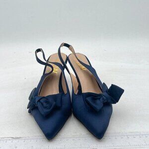 YDN Blue Pointed Toe Bow Slingback Slip on Pump Mid Heels Evening Prom Satin Sandals Dress Shoes